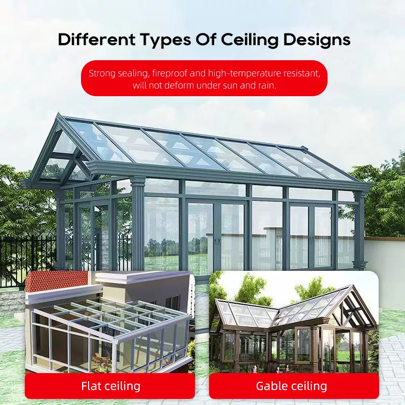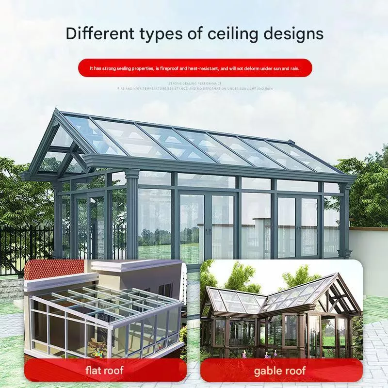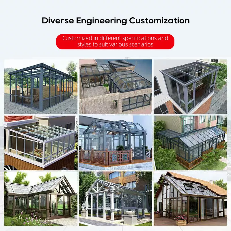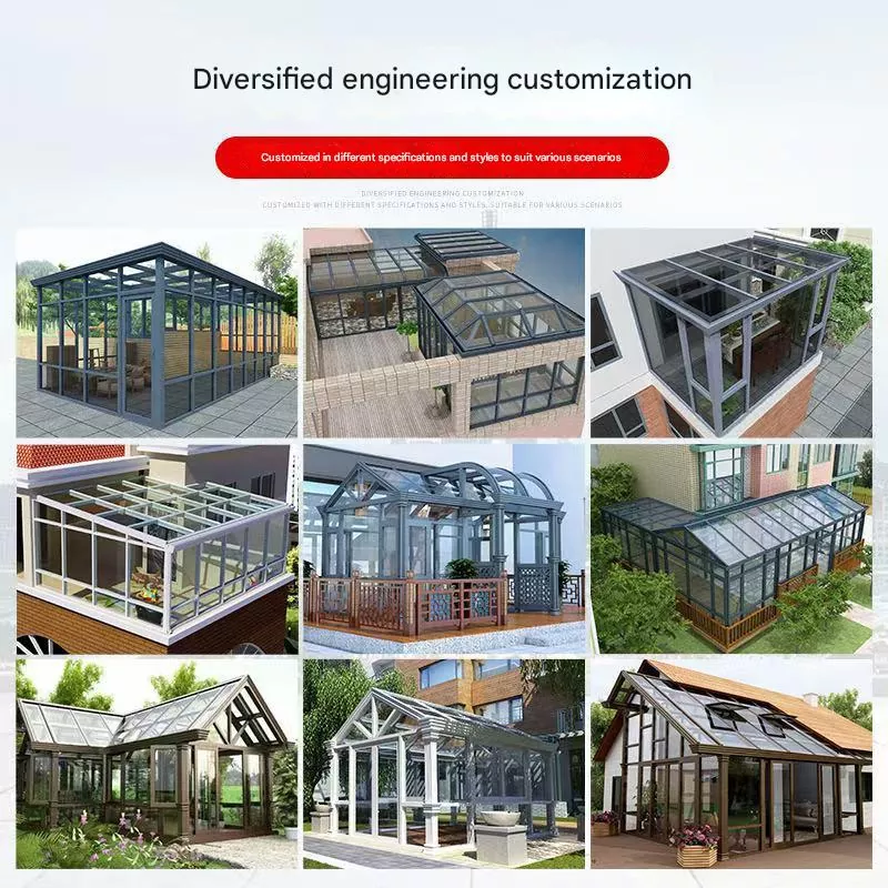 Сончевата соба усвојува а термо-пауза алуминиумска рамка + изолирана структура од калено стакло. Рамката се состои од столбови, греди и дијагонални потпори, собрани преку модуларен систем кој поддржува повеќе стилови на покриви, вклучувајќи фронтон покриви, рамни покриви и криви покриви.